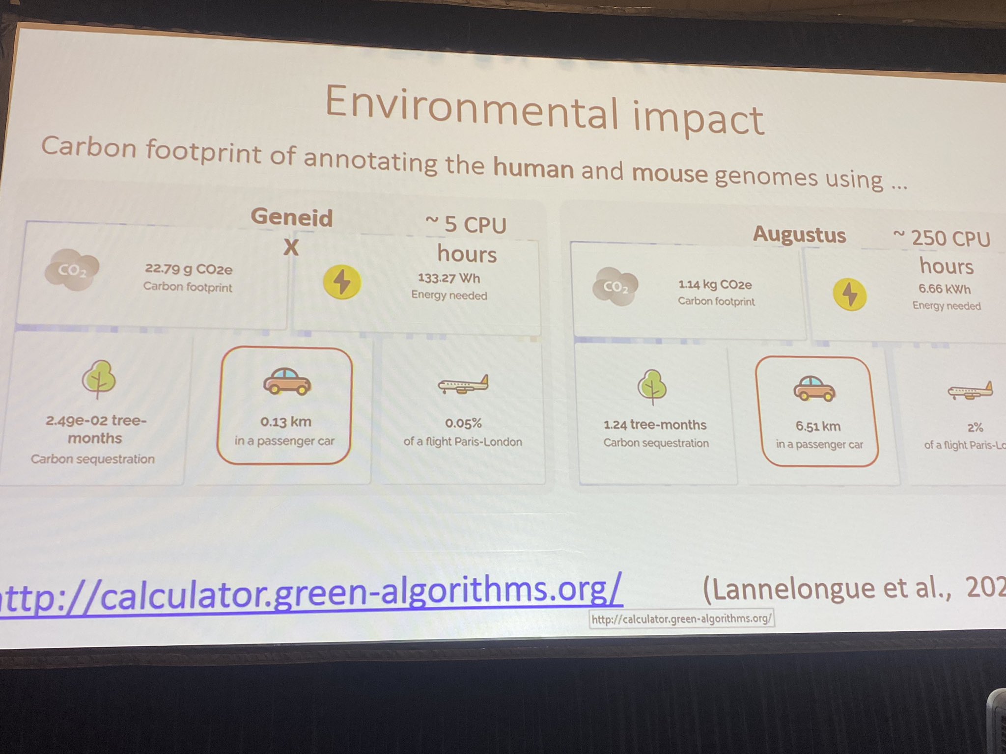 hace unos días nuestra colega Ana Conesa se hacía eco de una dispositiva de Roderic Guigó donde se resumía la huella de carbono de dos algoritmos para predicción de genes en genomas (Geneid vs Augustus):